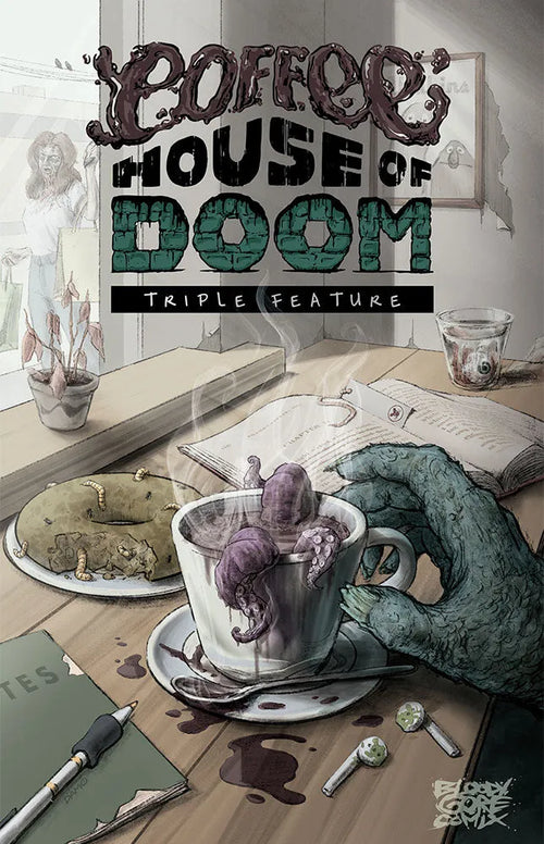 Comic book-style illustration of a woman in a fantasy setting with creatures and text.